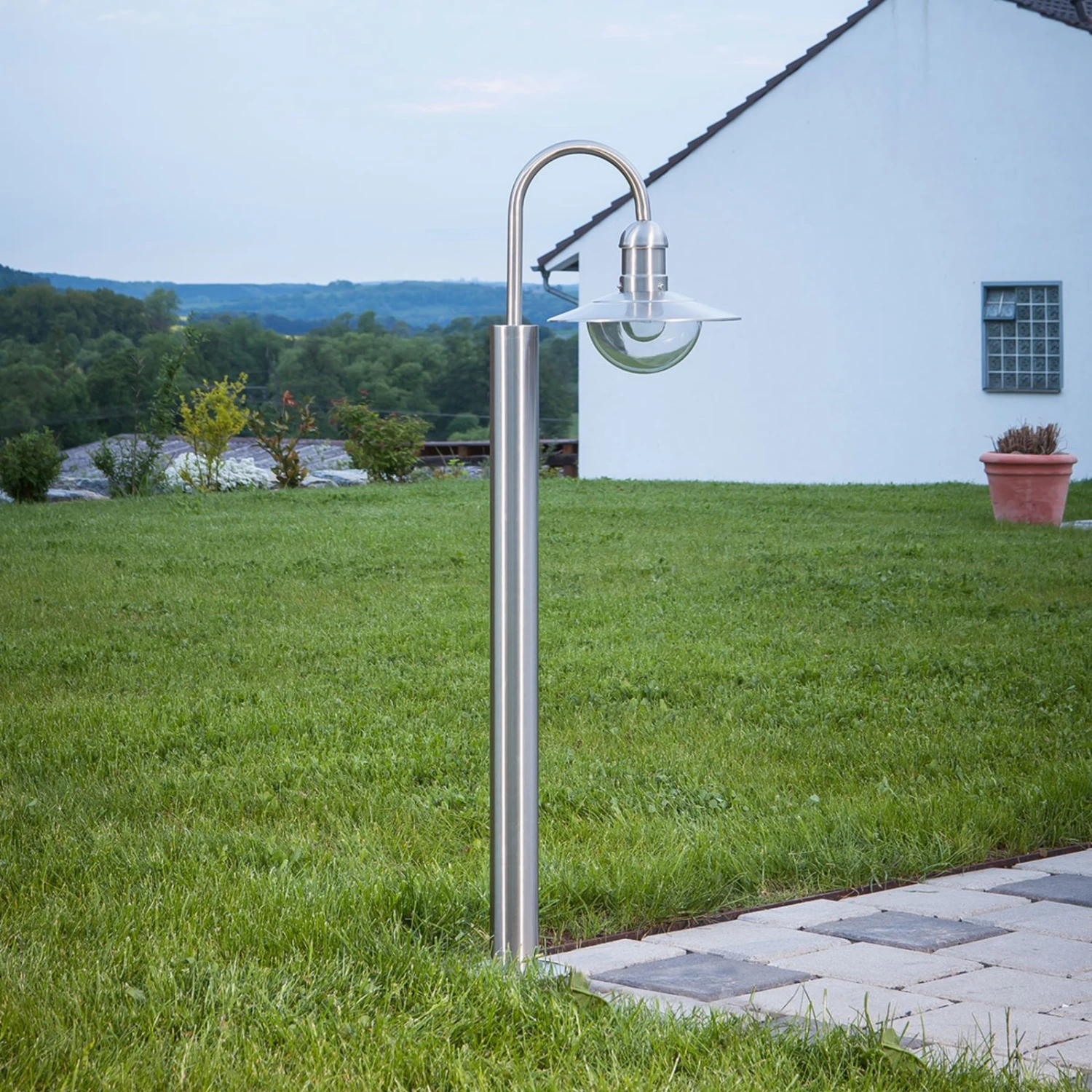 Borne lumineuse Damion courbée en inox, abat-jour transparent