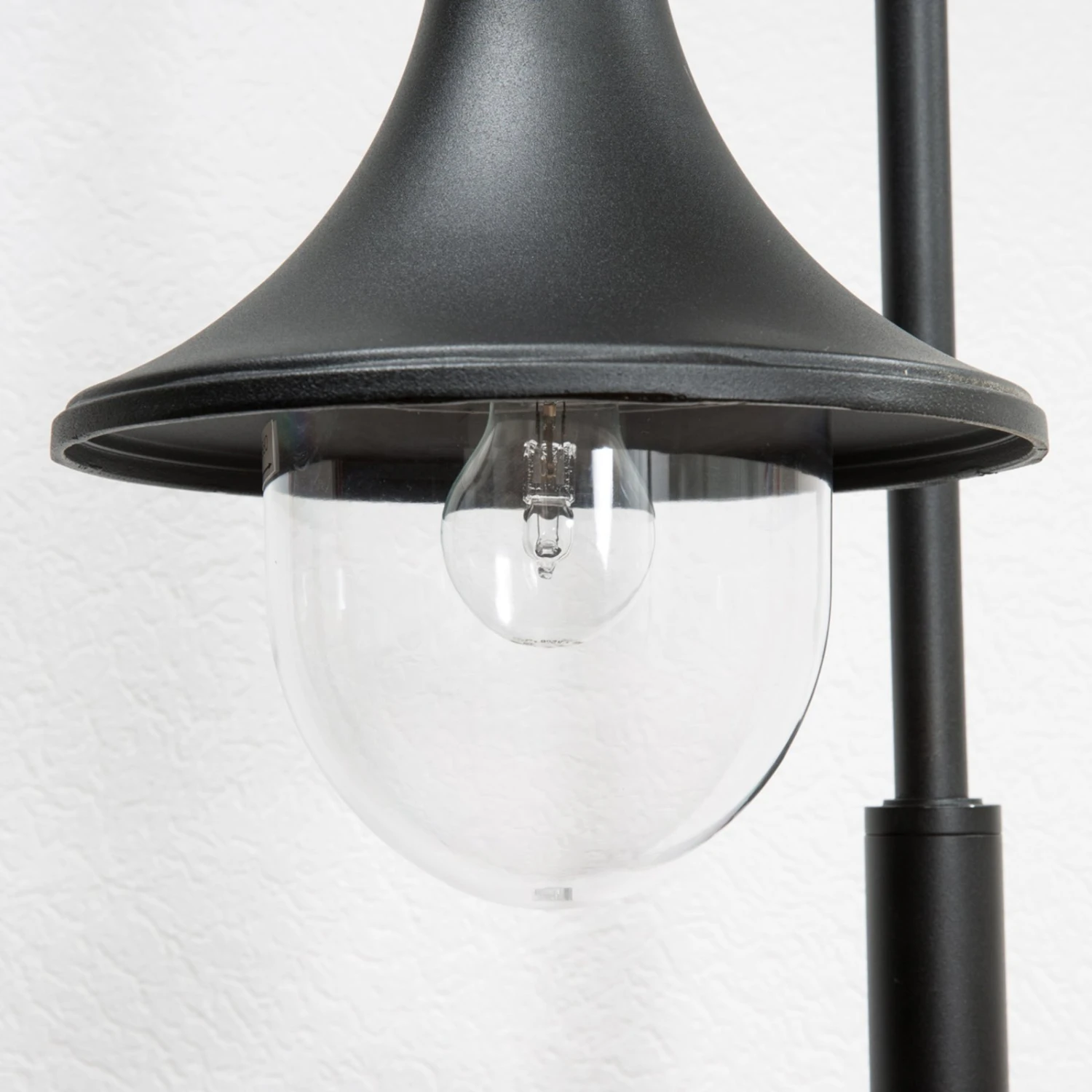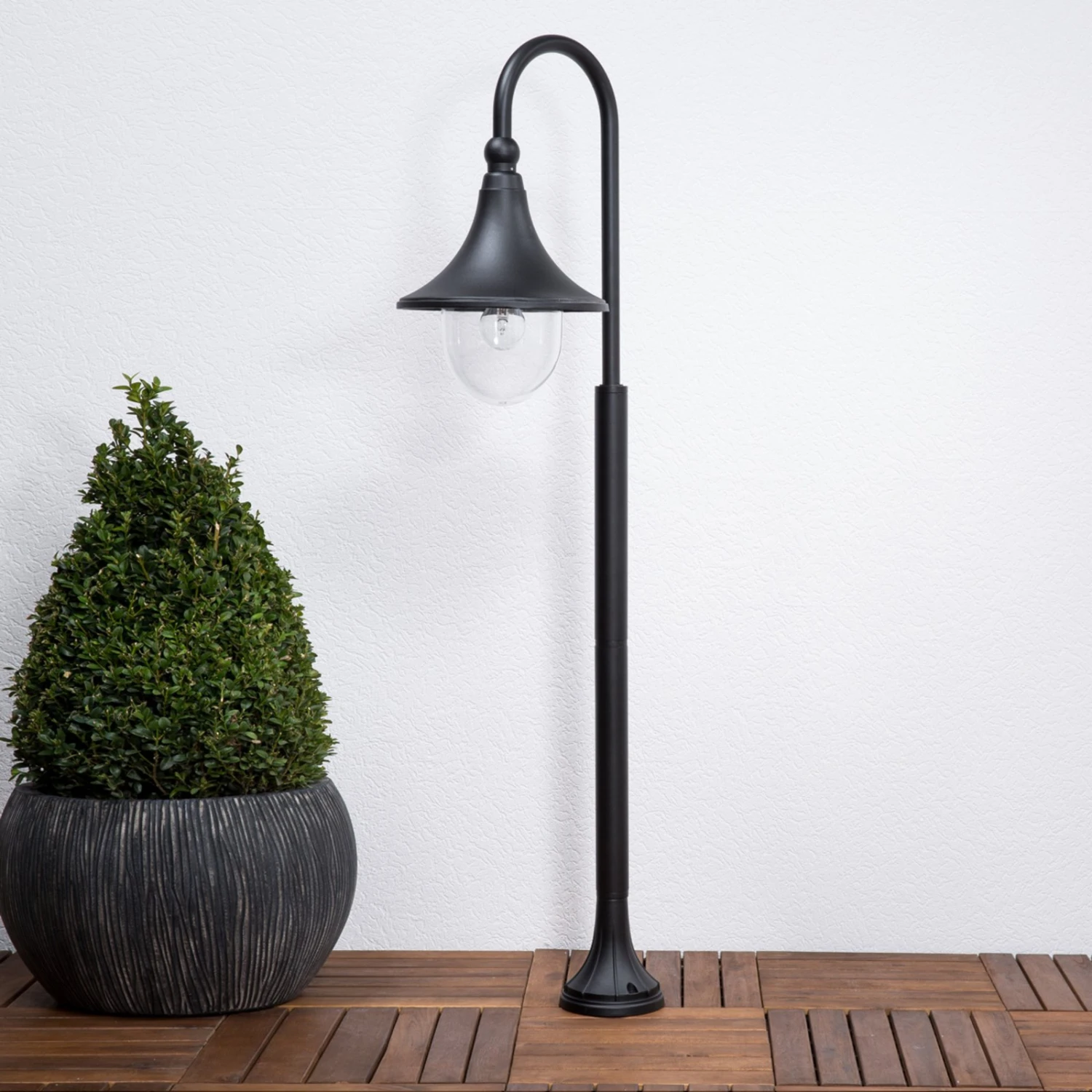 Les luminaires de la série Daphné se distinguent par leur aspect noir sobre et indémodable. La tête de lampe est reliée au support de la borne lumineuse au moyen d’un bras courbé. Par ailleurs, l’abat-jour s’écarte vers le bas, tel une cloche. L’ampoule est protégée par un diffuseur en polycarbonate transparent, ce qui garantit la robustesse du luminaire. Cette caractéristique a toute son importance à l’extérieur, en raison des différentes influences et conditions climatiques auxquelles il doit faire face. Grâce à sa douille à vis de type E27, le choix des ampoules adaptées est grand : il est possible d’utiliser des ampoules à incandescence ou halogènes classiques, mais également des lampes LED ou basse consommation, plus efficaces d’un point de vue énergétique.