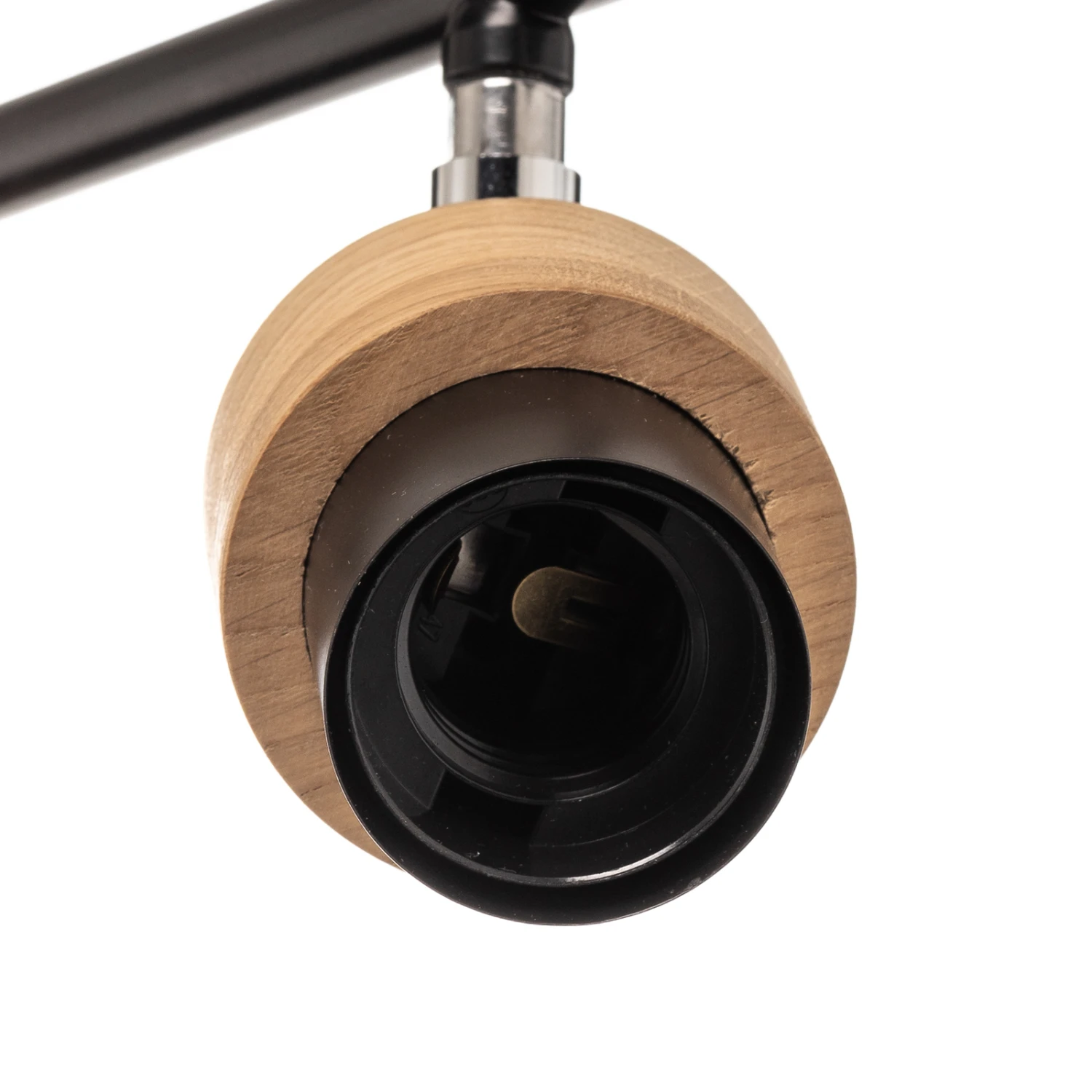 Le plafonnier Merlo offre pas moins de quatre douilles ouvertes dans lesquelles les ampoules à filament décoratives peuvent s’épanouir pleinement. Les douilles et le bras horizontal qui maintient les têtes de lampe orientables sur tout le pourtour sont fabriqués en métal laqué noir. Les têtes et la rosace ronde sont en revanche en bois de chêne clair huilé, qui enrichit la pièce de son effet chaleureux et naturel.