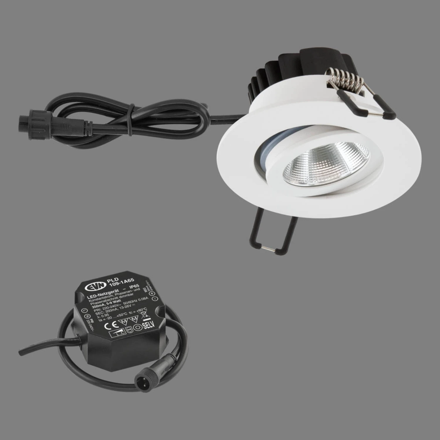 Grâce au type de protection IP65 (protection contre les jets d’eau et étanche à la poussière), il peut être utilisé sans problème dans les pièces humides et à l’extérieur. Le luminaire encastré à LED PC65 émet une lumière blanc chaud grâce à sa puissante puce LED et éclaire ainsi l’entrée, les passages dans la cour et les terrasses ou peut être utilisé de manière ciblée comme spotlight pour un éclairage d’effet.