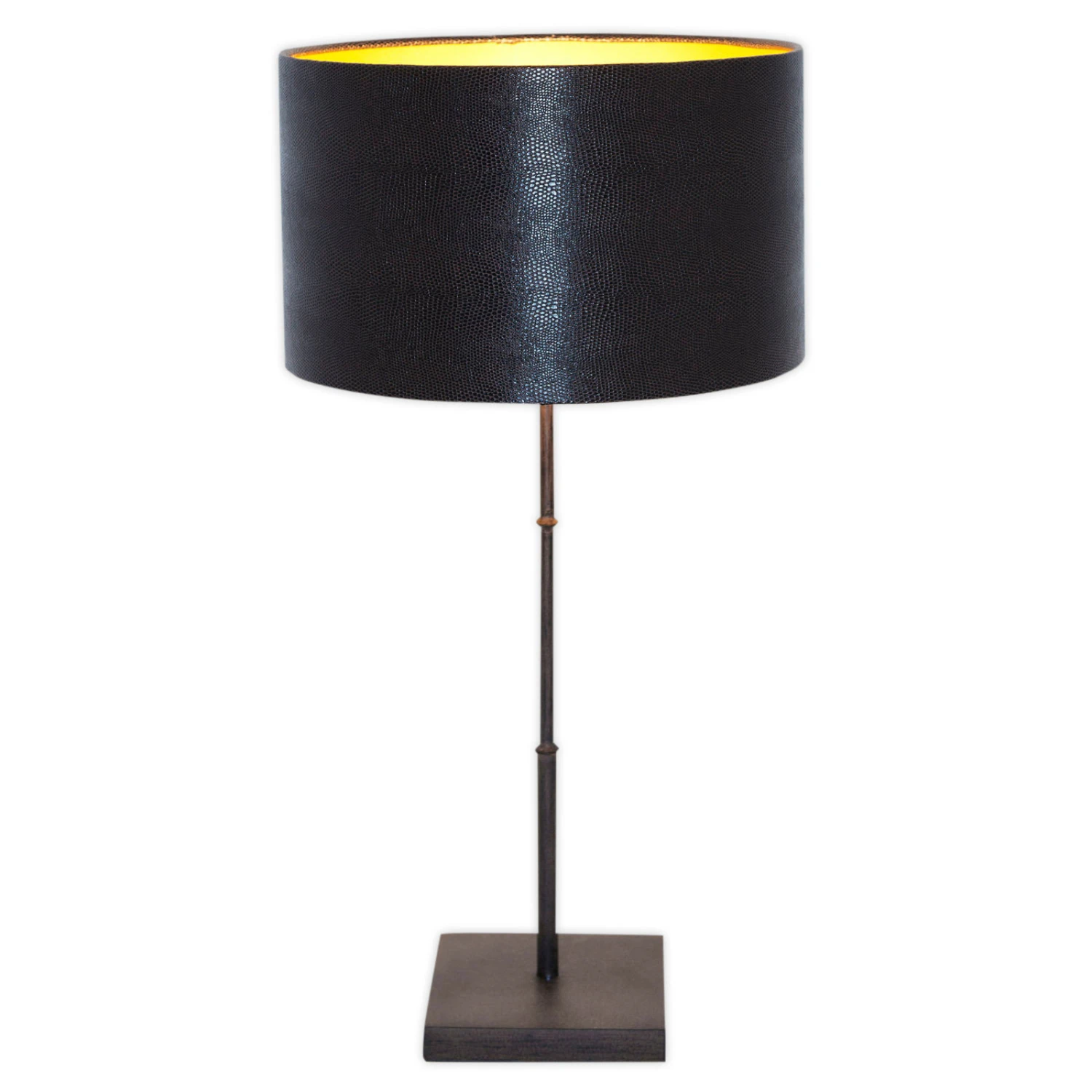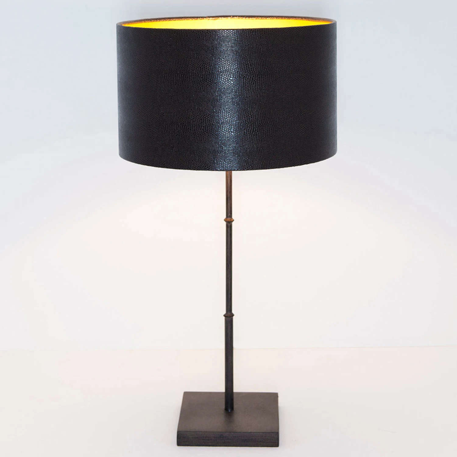 La lampe de table bambou attire l’attention par son design particulier : Son abat-jour est travaillé en brun de l’extérieur avec un motif de peau de lézard et trône sur une armature en fer brun-noir à base carrée. Dès que l’éclairage est allumé, l’intérieur laqué de couleur or de l’abat-jour met en scène la lumière rayonnante avec une chaleur particulière.