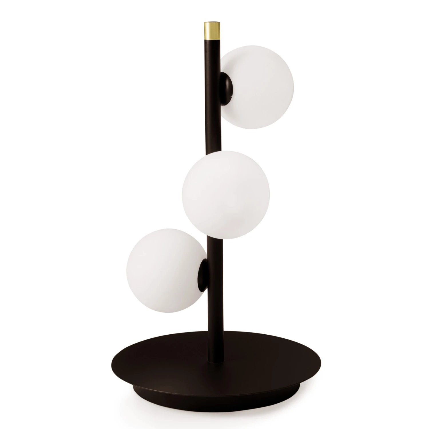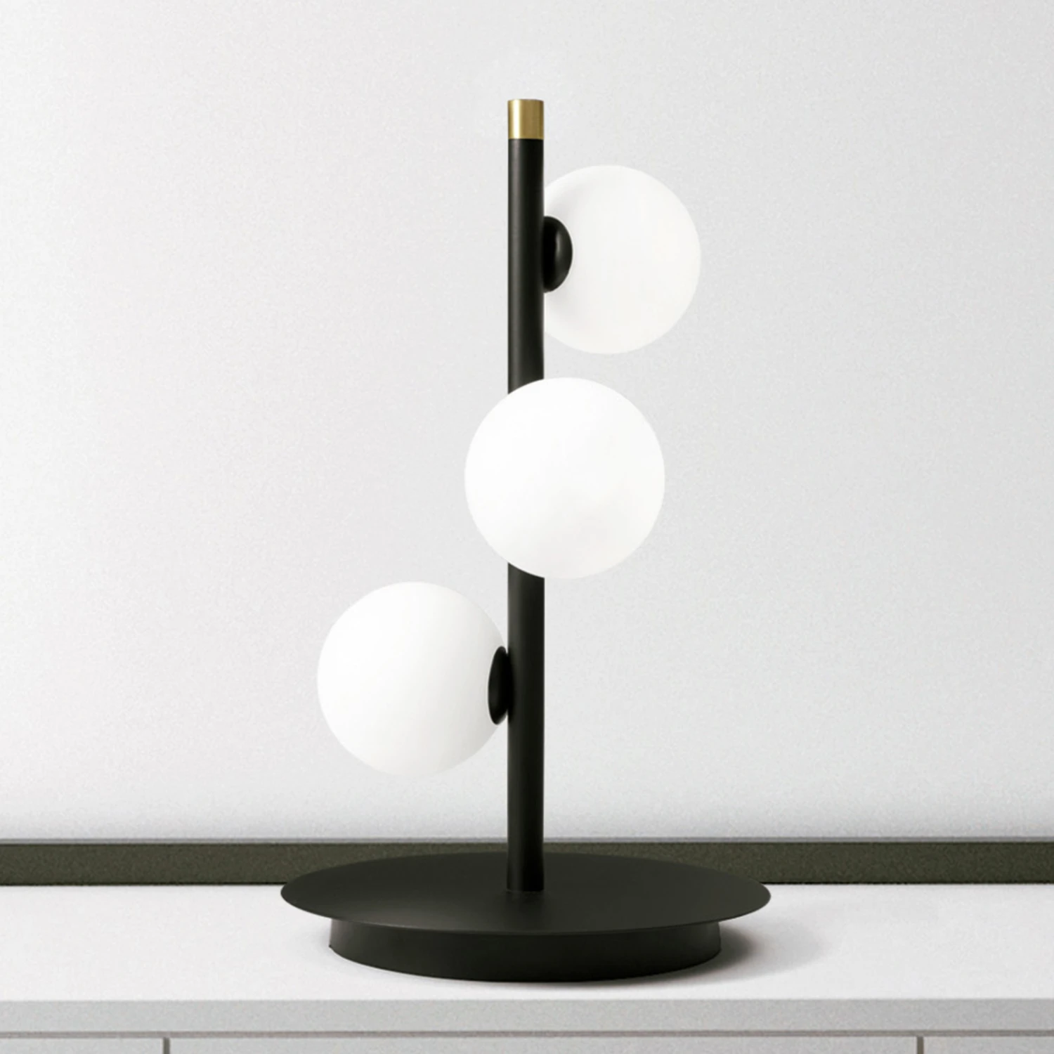 Les couleurs noir et blanc forment ensemble une combinaison de couleurs intemporelle et toujours moderne, ce qui fait de la lampe de table Pomi une source de lumière qui peut être intégrée dans de nombreux meubles. Les sphères de verre sont asymétriques et sont fixées à la tige de la lampe à différentes hauteurs dans toutes les directions. Cela permet d’éclairer tout autour et de créer un jeu d’effets de lumière et d’ombre passionnant.