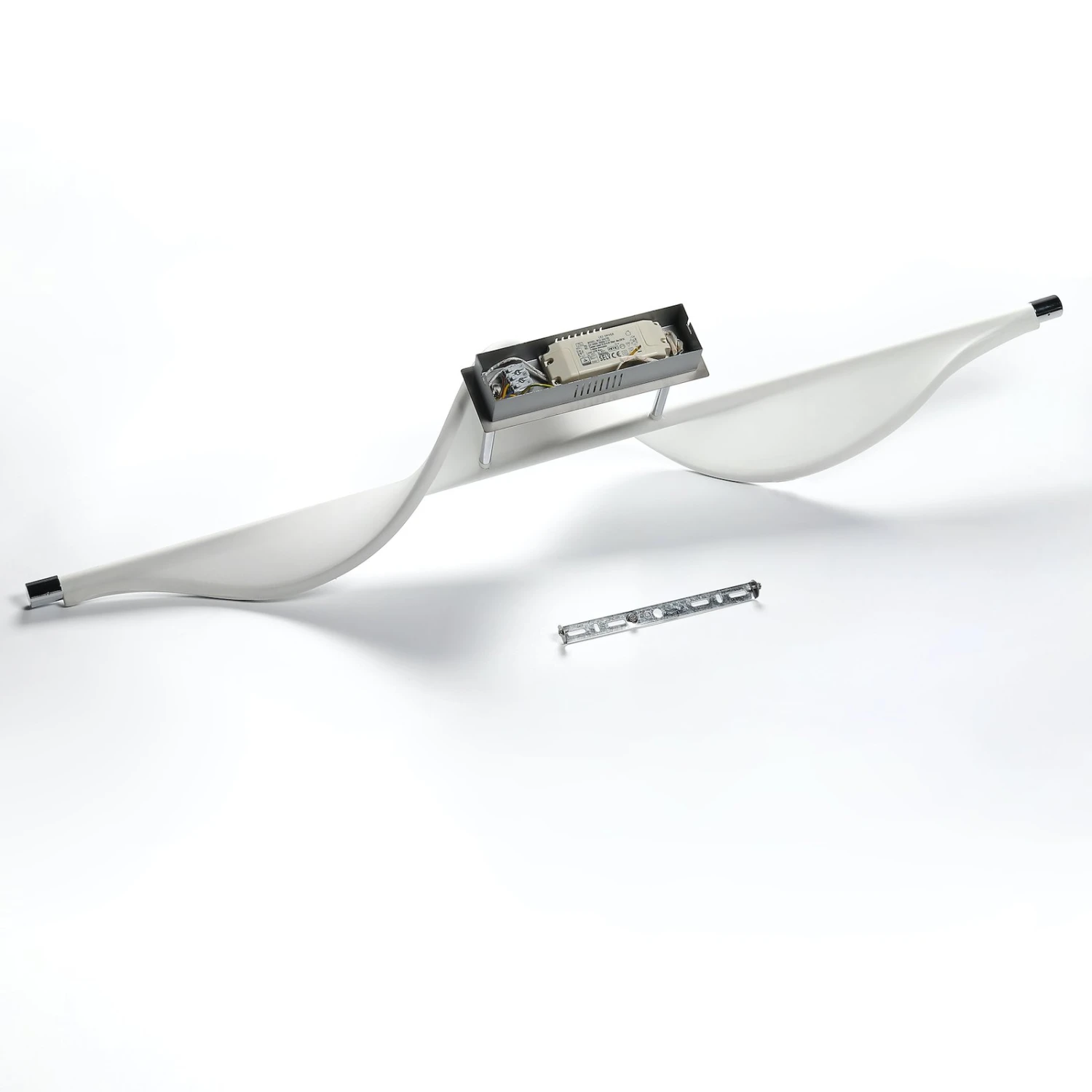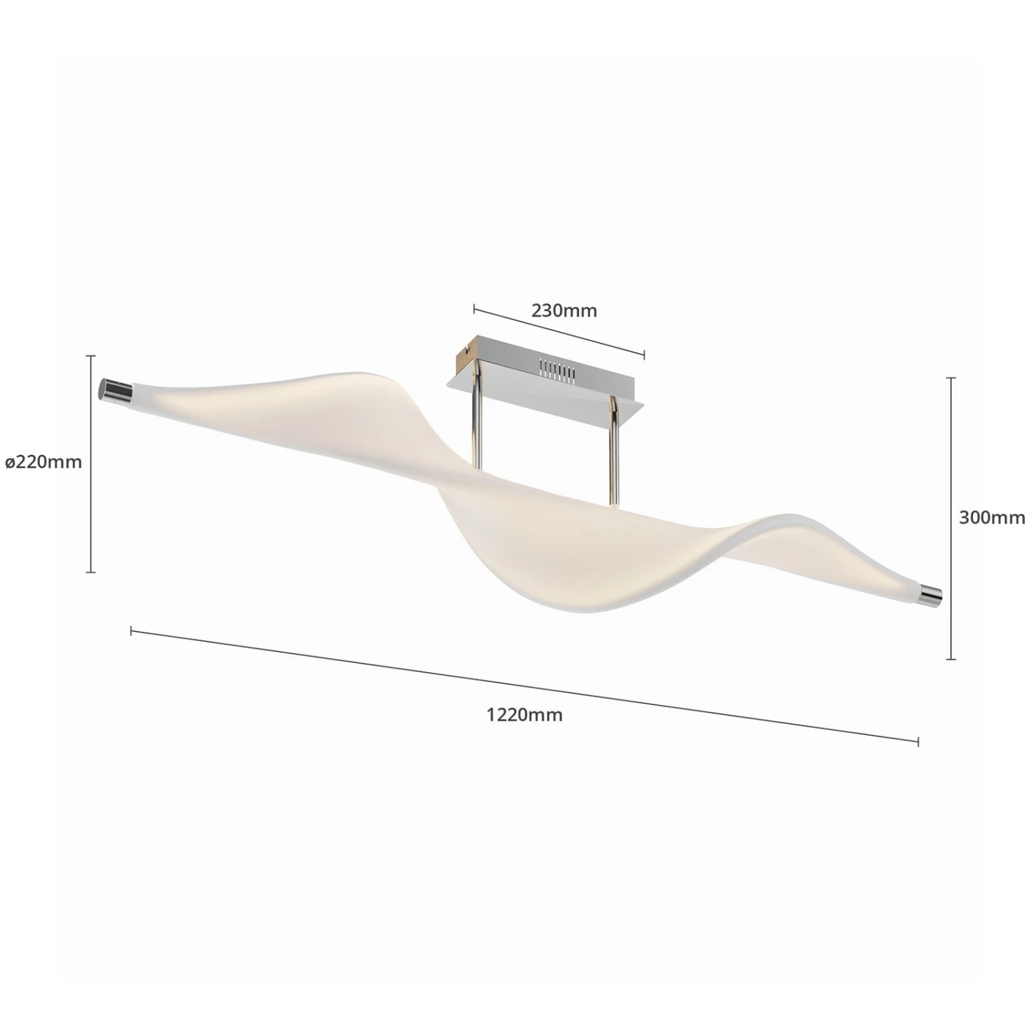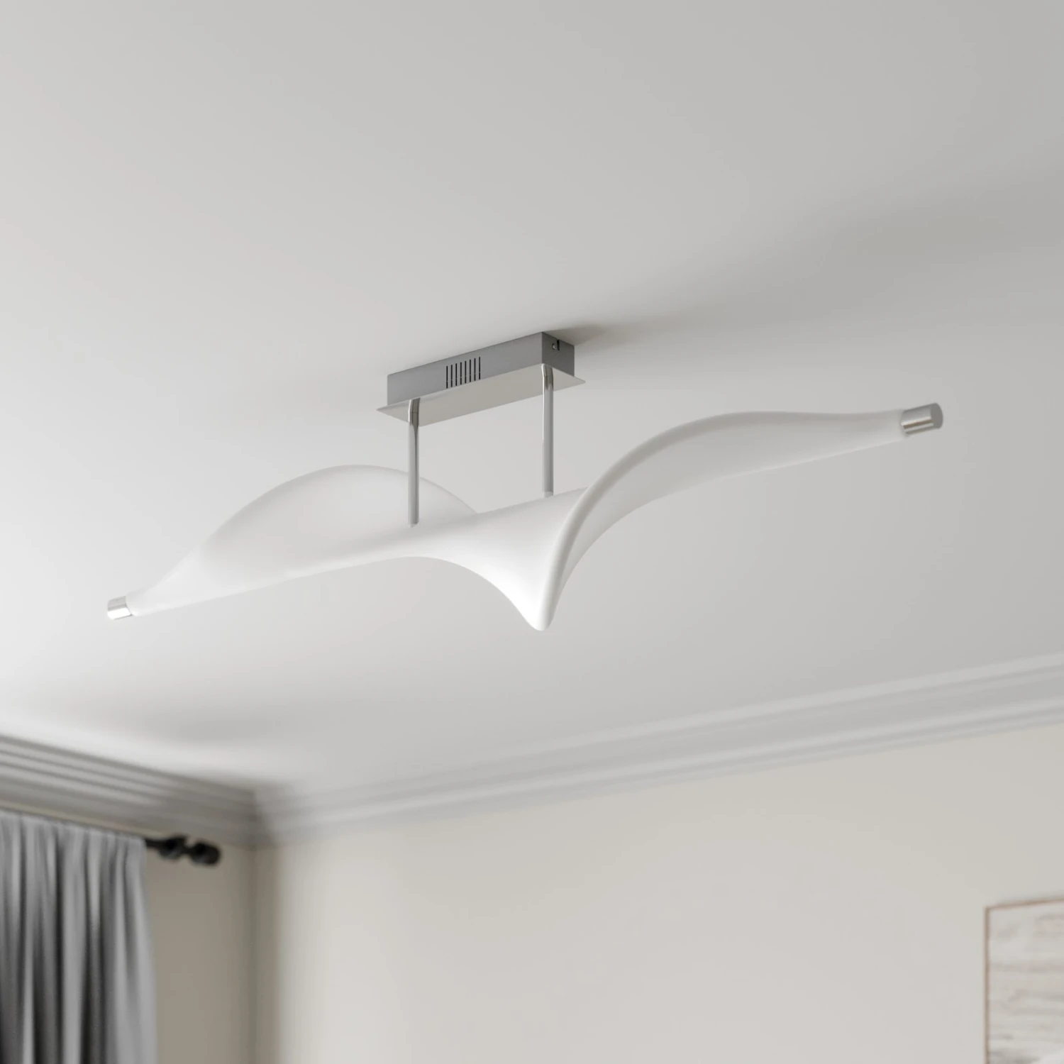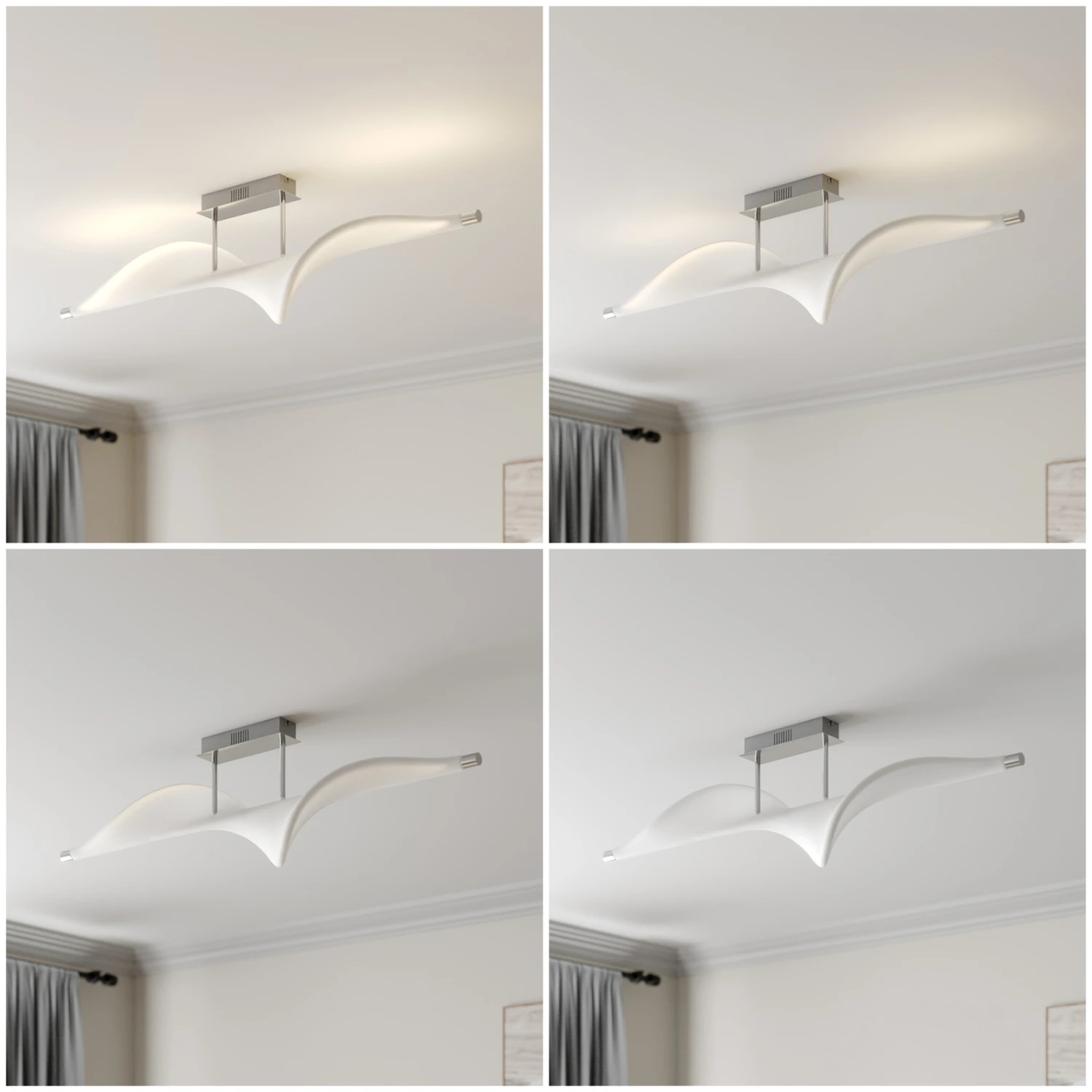 Comme un oiseau qui vole dans le vent avec ses ailes déployées, le plafonnier Edano ressemble à un oiseau avec son abat-jour en textile blanc, qui a été conçu dans une forme incurvée et suspendu à une petite distance du support en aluminium du plafond. Le plafonnier LED moderne impressionne par son design et sa taille extraordinaires, ce qui le rend idéal pour une grande salle de séjour ou une chambre à coucher.