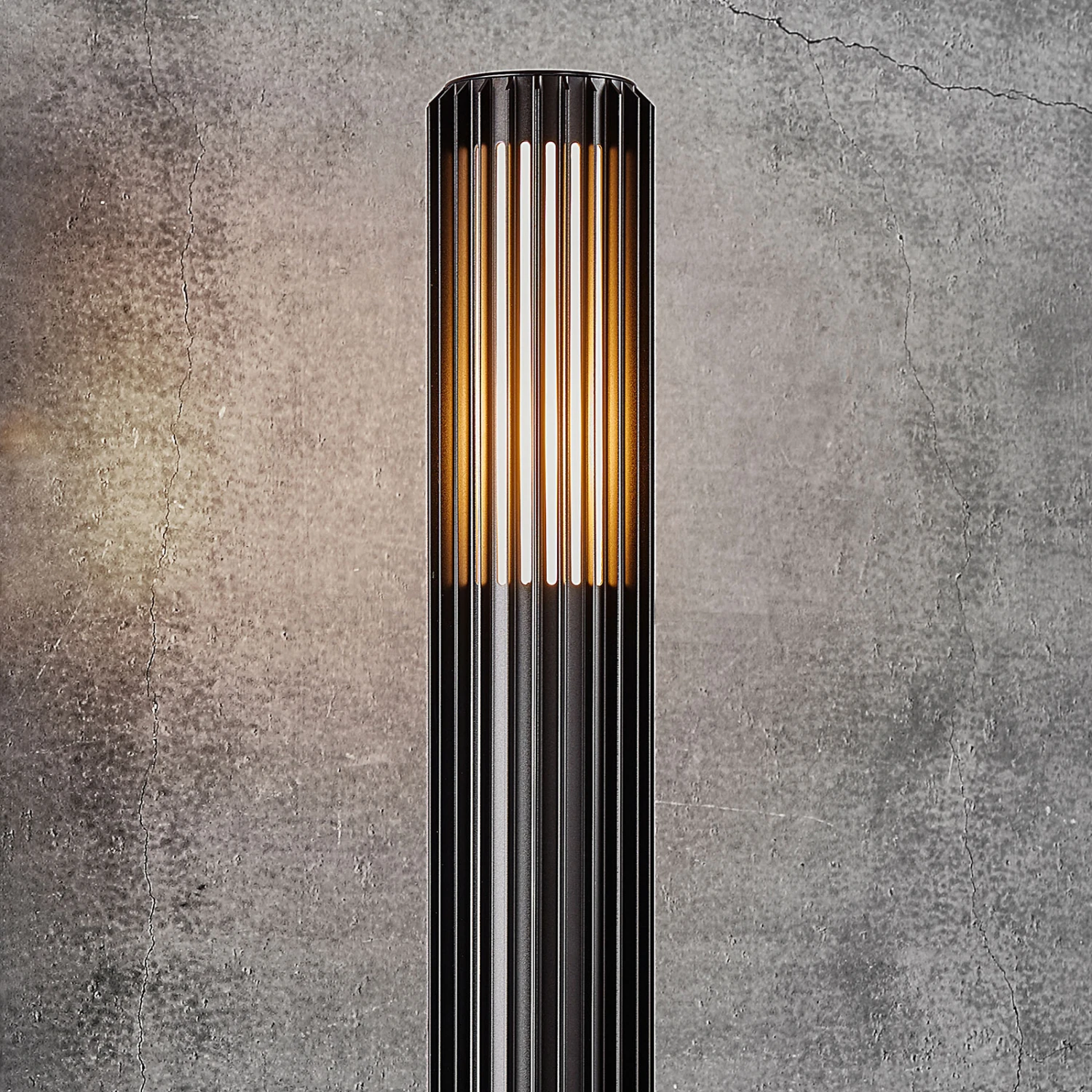 Luminaire d’allée élancé Aludra en aluminium anodiséLe boîtier spécialement traité du luminaire d’allée Aludra est plus résistant à la corrosion que le métal peint et apporte ainsi une caractéristique importante d’un luminaire d’extérieur. Dans sa partie supérieure, la colonne cylindrique nervurée est équipée à l’intérieur d’un diffuseur sous lequel est vissée l’ampoule. La lumière brille ainsi à travers les lamelles et éclaire les trottoirs et les allées. Un piquet de fixation spécialement conçu donne la stabilité nécessaire à l’extérieur.