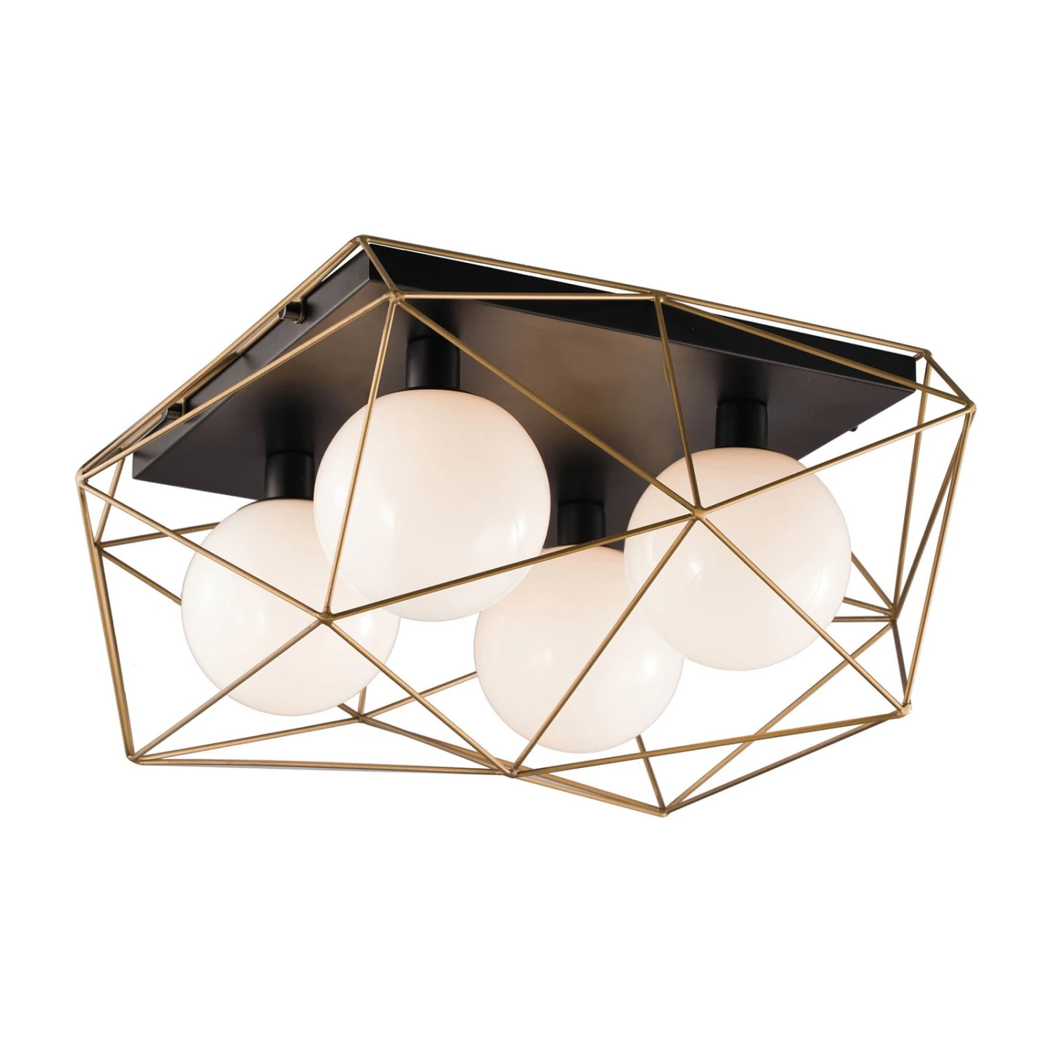 Quatre sphères d’un blanc mat trouvent leur place sur une plaque de plafond carrée et noire. Celles-ci sont entourées d’un cadre métallique de couleur or, qui crée un beau contraste avec les boules lumineuses opales et la plaque sombre. La lumière tombe ici de manière particulièrement douce et homogène vers le bas dans la pièce et fournit un bon éclairage général.