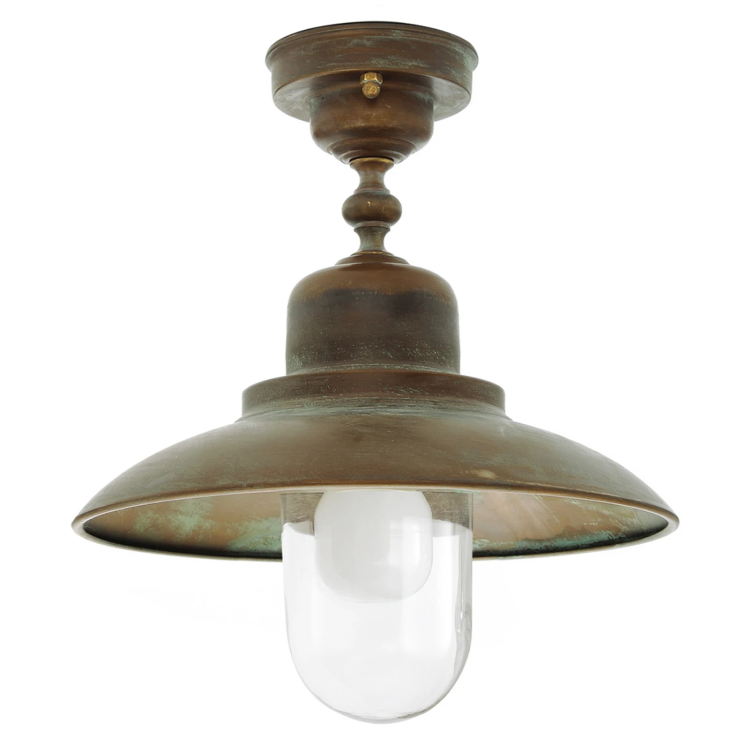 Plafonnier Turino à l’aspect antique et à l’éclairage d’ambianceLe plafonnier Turino permet de mettre en valeur l’espace extérieur avec autant de style que de l’accentuer merveilleusement. Le luminaire se distingue par son design sobre et sa surface en laiton antique, obtenue par un procédé chimique. La lumière est largement diffusée à travers le corps en verre transparent qui entoure l’ampoule E27 pour la protéger, ce qui éclaire idéalement l’environnement et crée une ambiance agréable. De plus, Turino résiste à l’air salin que l’on trouve à proximité de la mer (résistant à l’eau de mer).