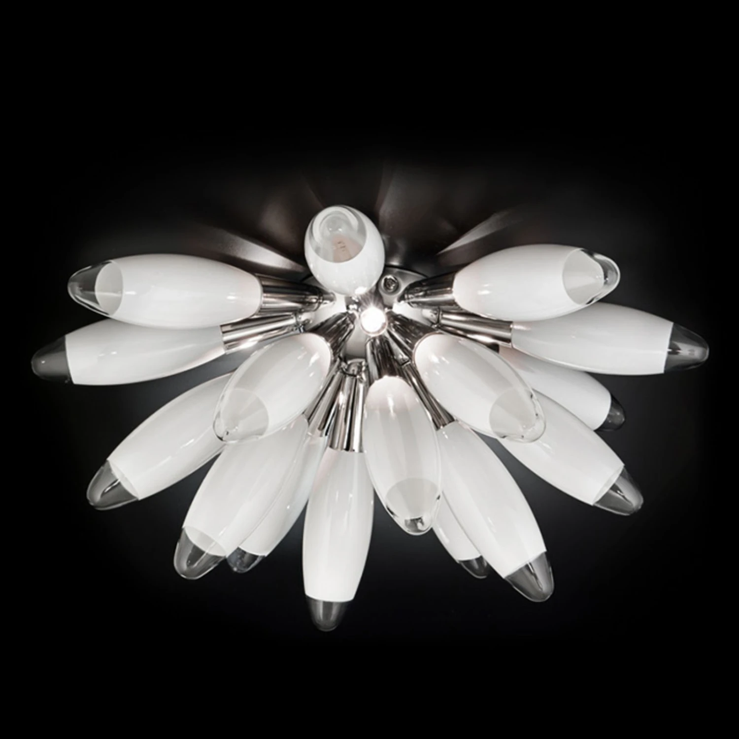 Ce plafonnier extravagant se compose de dix-huit éléments en verre blanc qui se dirigent du centre vers l’extérieur en se terminant en pointe. Entre ces éléments, qui partent d’une petite boule au centre du luminaire telles des épines, se cachent trois petites ampoules halogènes qui produisent une lumière éclatante avec laquelle cet extraordinaire objet d’éclairage illumine la pièce.