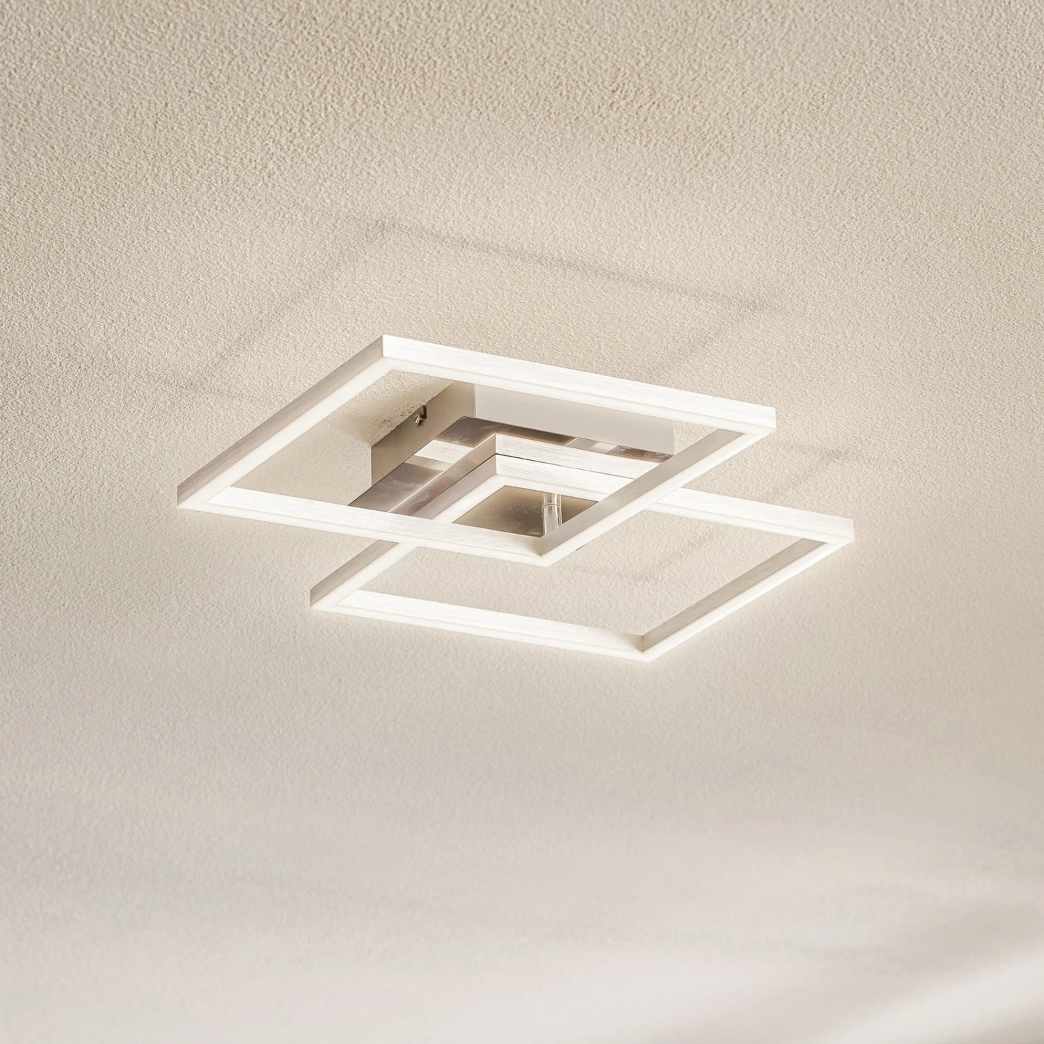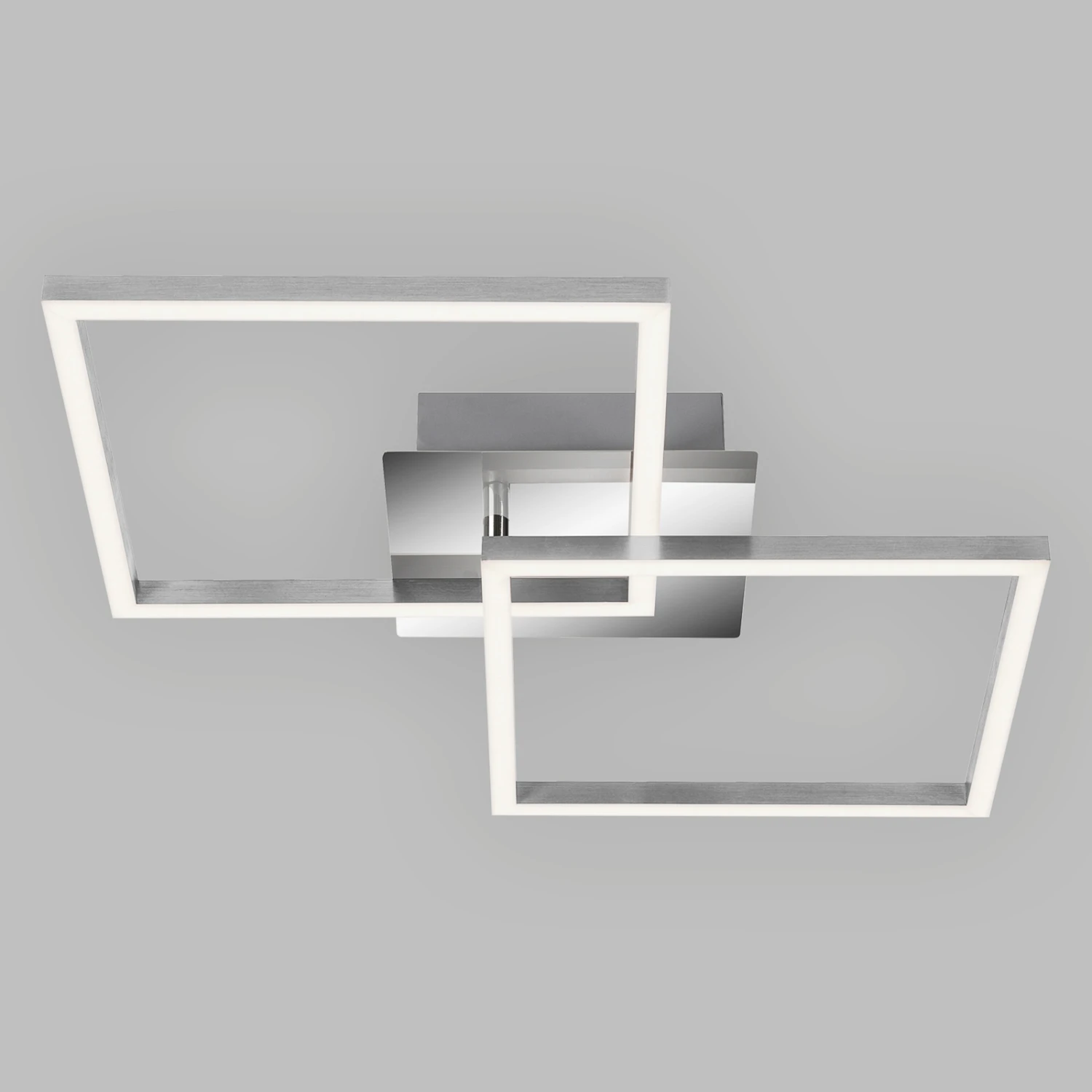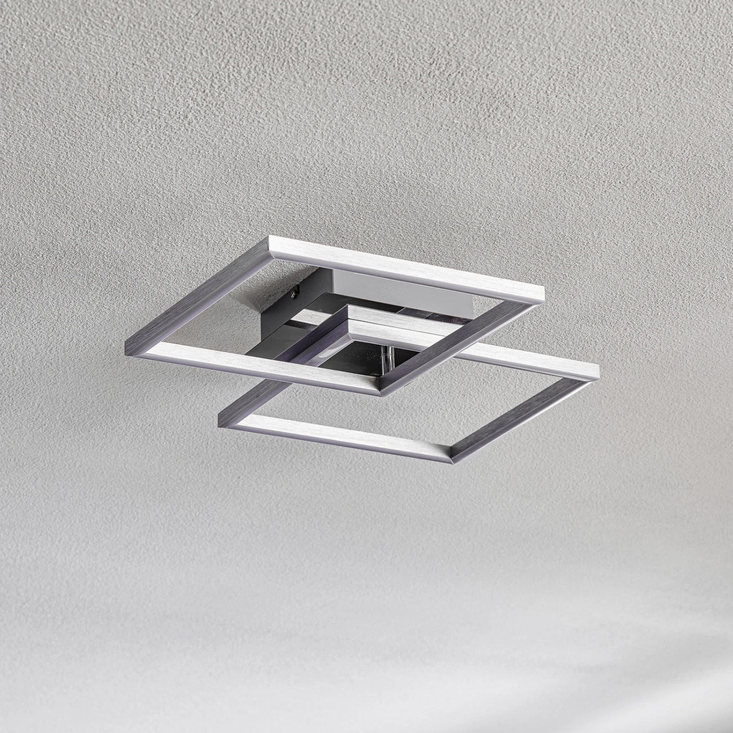 Le plafonnier à LED est composé de deux cadres carrés et sert de pièce de design moderne dans les intérieurs contemporains. La couleur argentée lui confère un aspect élégant qui s’intègre sans effort dans de nombreux espaces de vie. Le luminaire peut être gradué par étapes via l’interrupteur mural, ce qui permet d’ajuster parfaitement les conditions d’éclairage. Les LED installées en permanence le long du cadre émettent une lumière blanche et chaude qui crée une atmosphère agréable dans la pièce.