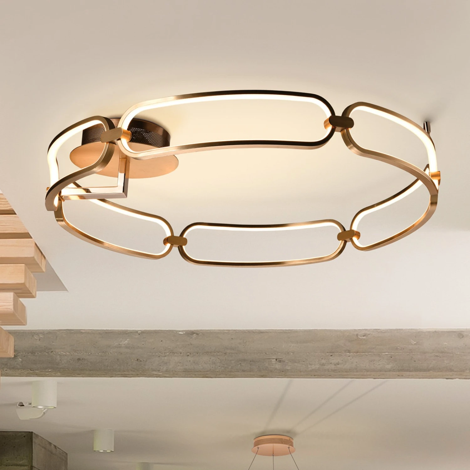 Ce plafonnier est un pur régal pour les yeux : Colette se compose de six éléments métalliques en forme de barrette, dont les bords intérieurs sont recouverts de diffuseurs opales, derrière lesquels sont installées les LED. Il en résulte un éclairage de la pièce sans éblouissement qui, malgré toute la puissance des LED, est économique à l’usage. Un autre détail esthétique est le baldaquin de plafond décentralisé, également fabriqué en métal avec une finition or rose.