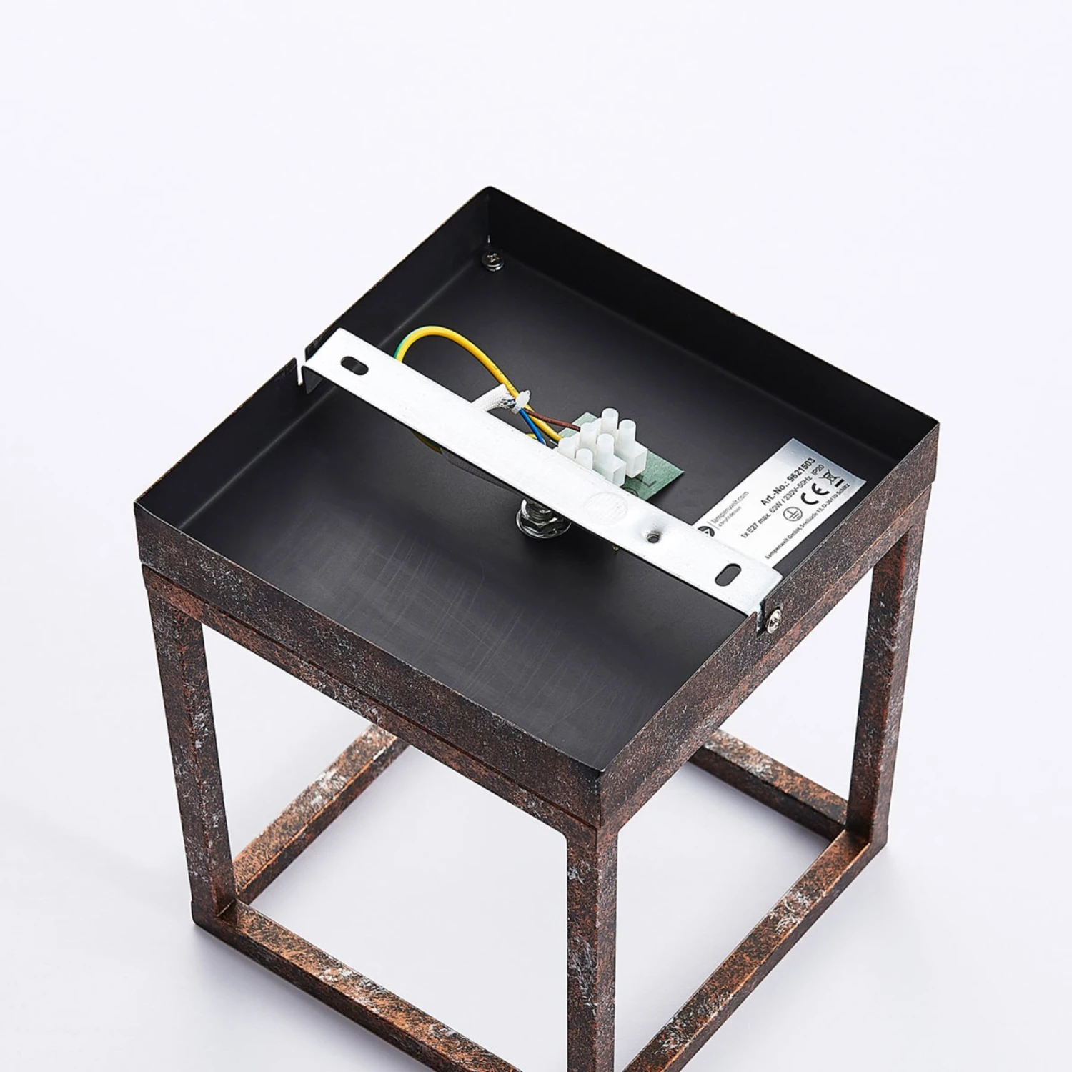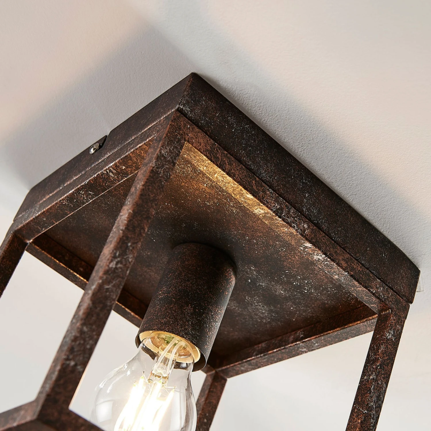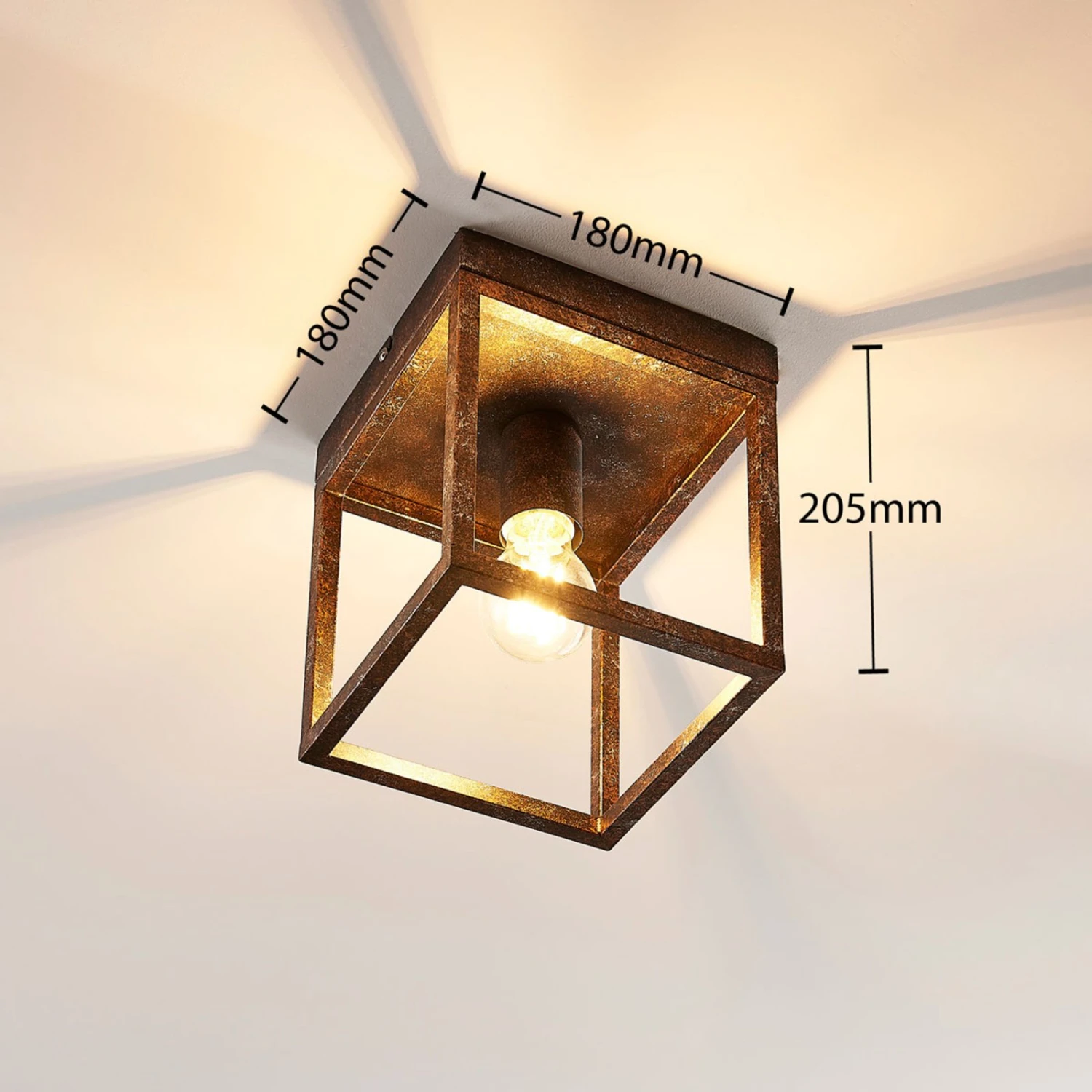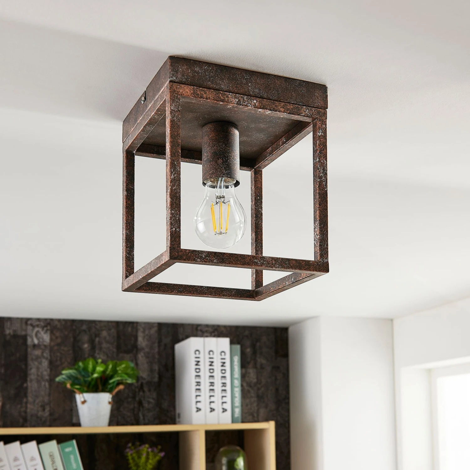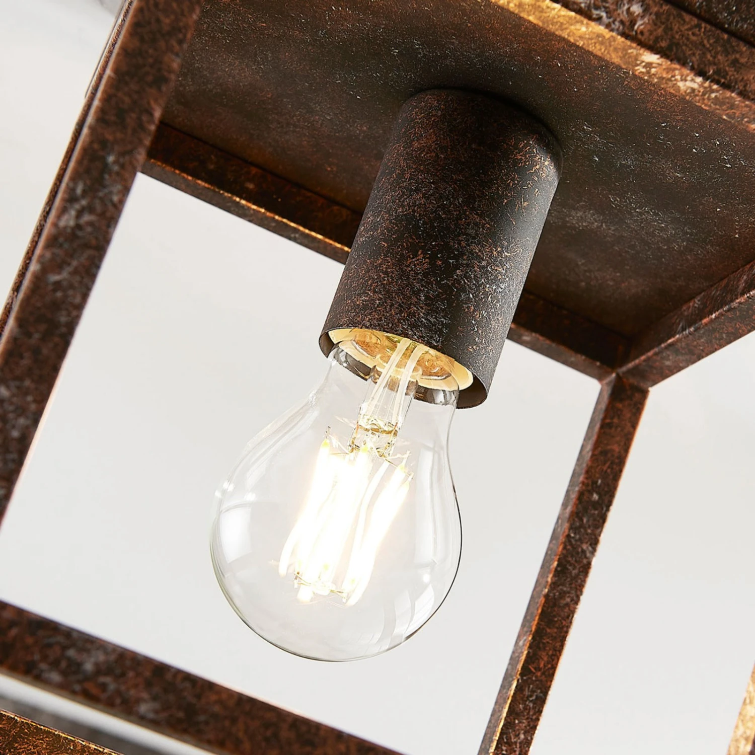 Emin se compose d’un cadre métallique de forme tridimensionnelle et est dépourvu d’inserts en verre. Avec sa belle finition rouillée, Emin dégage un aspect antique qui peut aussi parfaitement bien être combiné avec un intérieur moderne. Quel que soit le cadre offert à ce plafonnier, une chose est certaine : l’ampoule reste nettement visible. C’est pourquoi cette ampoule doit être choisie avec beaucoup de soin afin que l’impression globale dégagée soit équilibrée. Quoi donc sinon qu’une ampoule LED à technologie à filament pourrait mieux convenir sur le plan technique et optique ? Il est aussi possible d’utiliser des ampoules à l’aspect rustique car elles complètent de manière très esthétique la note antique de ce plafonnier.