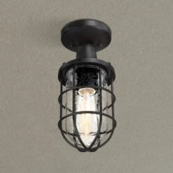 Le boîtier résistant du plafonnier d’extérieur Crestview est en acier avec une surface structurée en noir et a la forme d’une cage. À l’intérieur se trouve un abat-jour en verre avec de fines inclusions d’air. Le verre antique produit une lumière légèrement diffuse et est également très agréable à regarder de près lorsque ce plafonnier n’est pas allumé.
